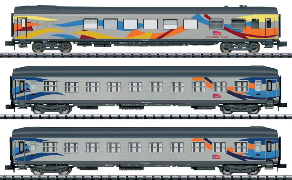 couleurs sur les côtés Logo dégradé Eclairage intérieur par leds en option (Réf. 66616) Attelages à élongation Longueur totale de la rame : 306 mm Annonce dans Loco Revue N° 884 de mars 2021 Annonce de la sortie dans Loco Revue N° 893 de décembre 2021 Coffret complémentaire du coffret 18210 |