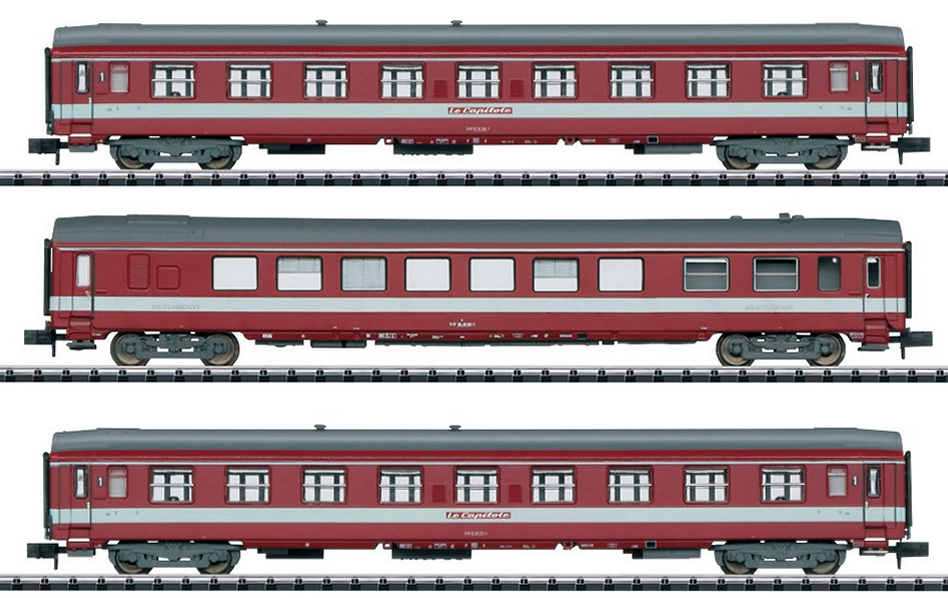 Livrée Capitole rouge avec bande blanche Logo capitole prééqquipement pour éclairage intérieur Attelages à élongation Longueur totale de la rame : 306 mm Référence présente sur le catalogue général 2018/2019 ainsi que dans le catalogue général 2019/2020 Test dans Loco revue N° 884 de mars 2021 |