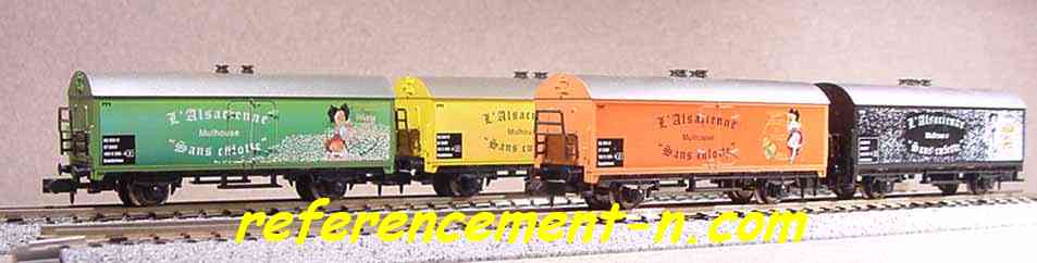 | Description | 4 wagons couverts 2 essieux transport bière marquage Bière l'Alsacienne sans culotte de Mulhouse représentant les 4 saisons | |