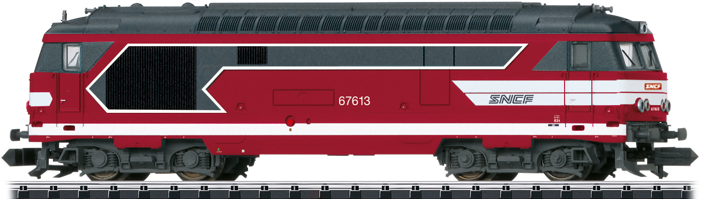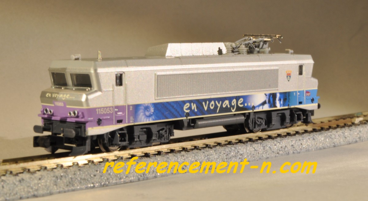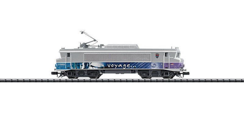 une face frontale bleue, l'autre violette, pelliculage En Voyage Logo casquette blanc Interface digitale MTc14 Attelages courts à élongation Deux bogies moteurs Moteur 5 pôles Deux volants d'inertie Prise de courant par les roues ou le pantographe Longueur : 109 mm Annonce dans Loco Revue N° 884 de mars 2021 Annonce dans la brochure Minitrix 2021 Annonce de la sortie dans Loco Revue N° 905 de décembre 2022 Historique du modèle réel |