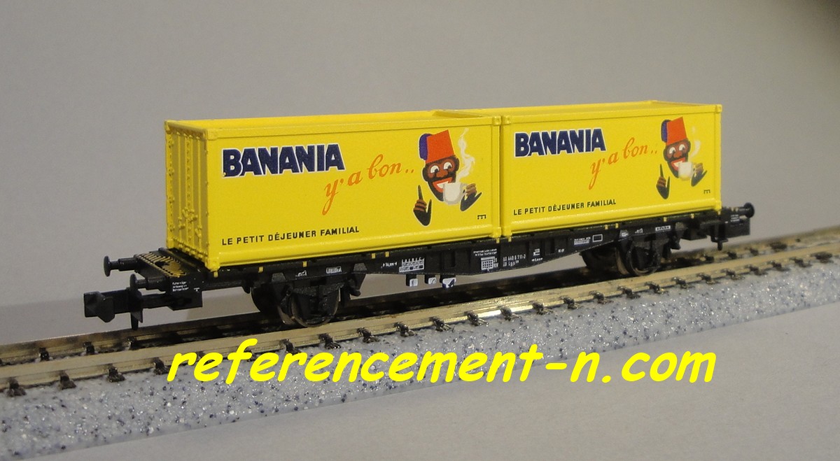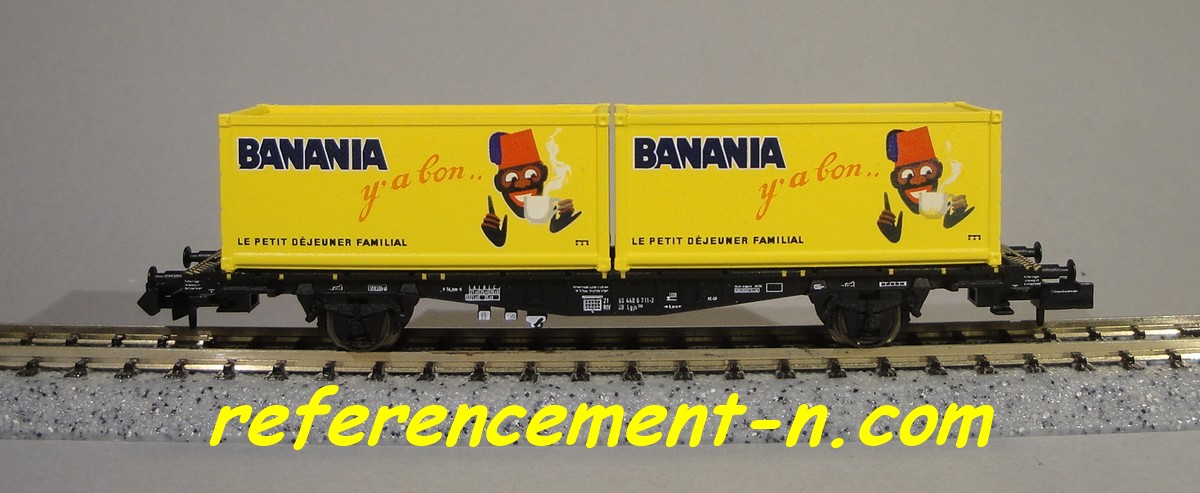 Wagon plat porte conteneurs jaunes marquage Banania |