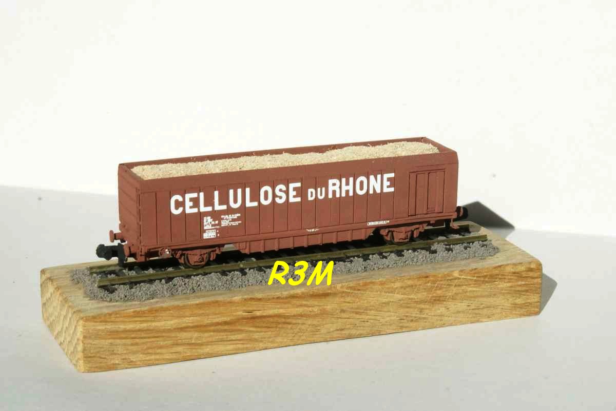 Wagons transport de sciure de bois type Fs marquage LA CELLULOSE DU RHONE (chargé) |