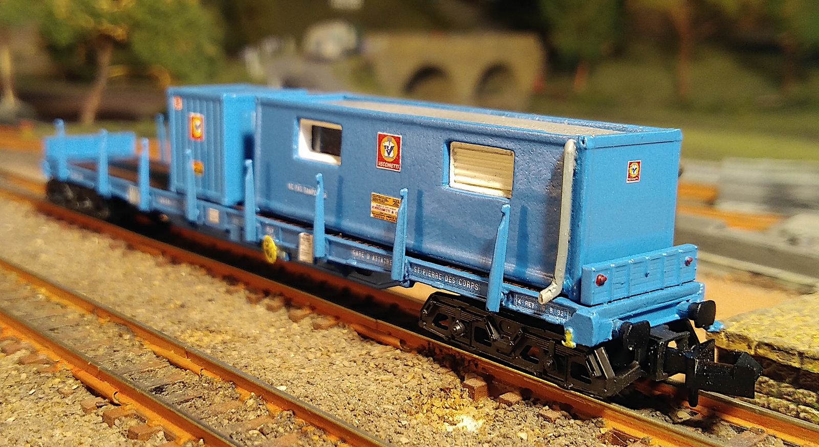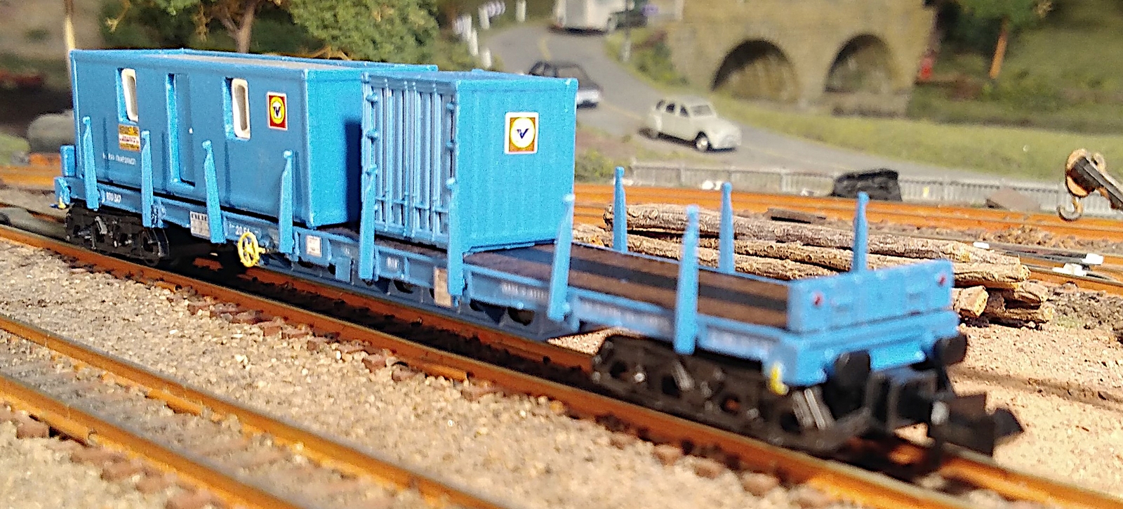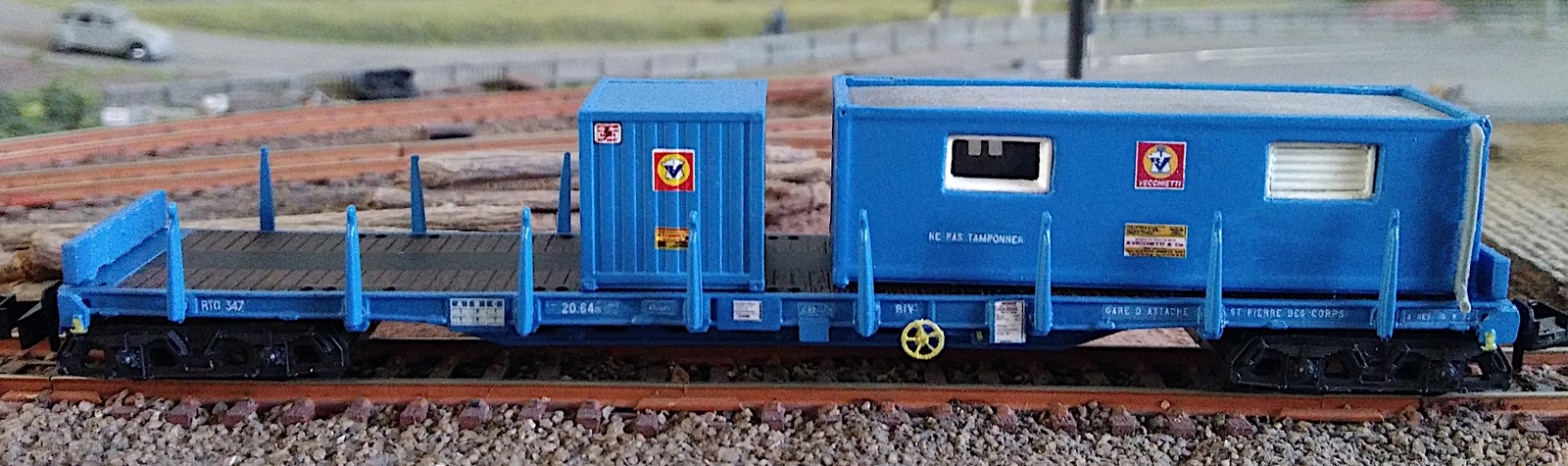 | Description | Wagon plat à bogies et ridelles basses chargé d'un conteneur bureau et d'un conteneur pour du matériel | |
