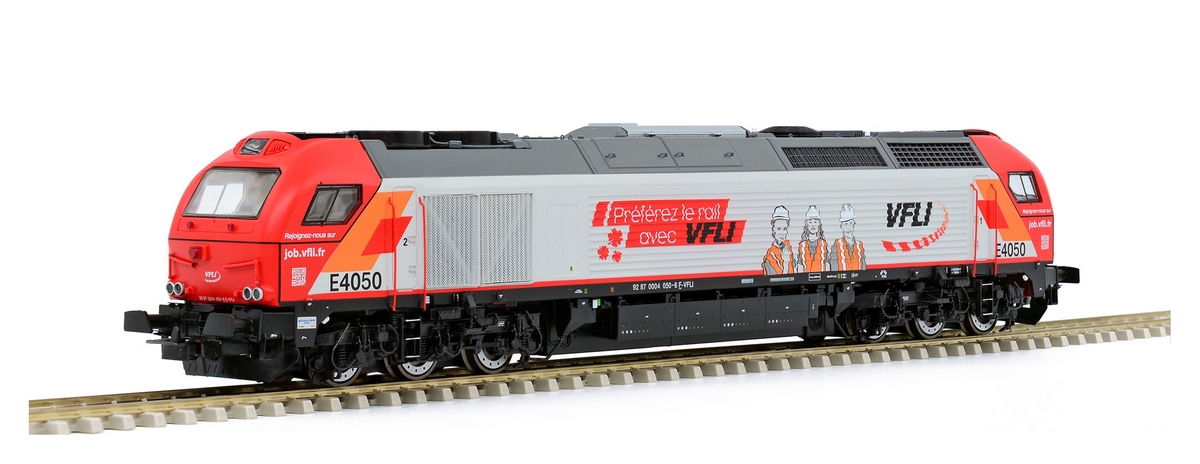Livrée VFLI Marquage "Préservez le rail avec VFLI" Couleurs rouge, orange et grise Longueur hors tampons : 145,00 mm Attelage court à élongation Interface digitale NEM660 à 21 contacts Existera aussi en version digitale sonorisée Historique du modèle réel |