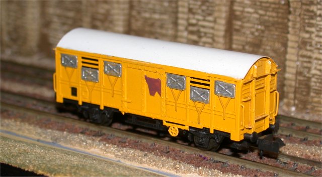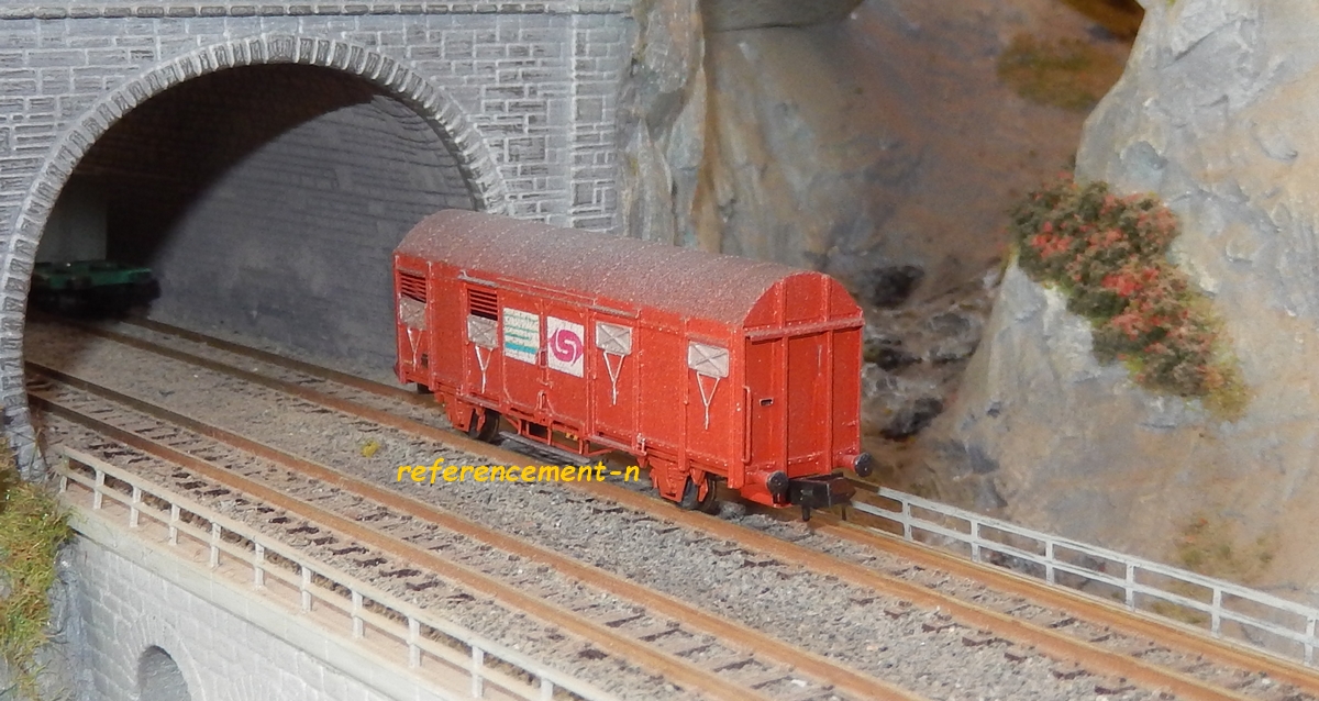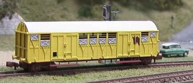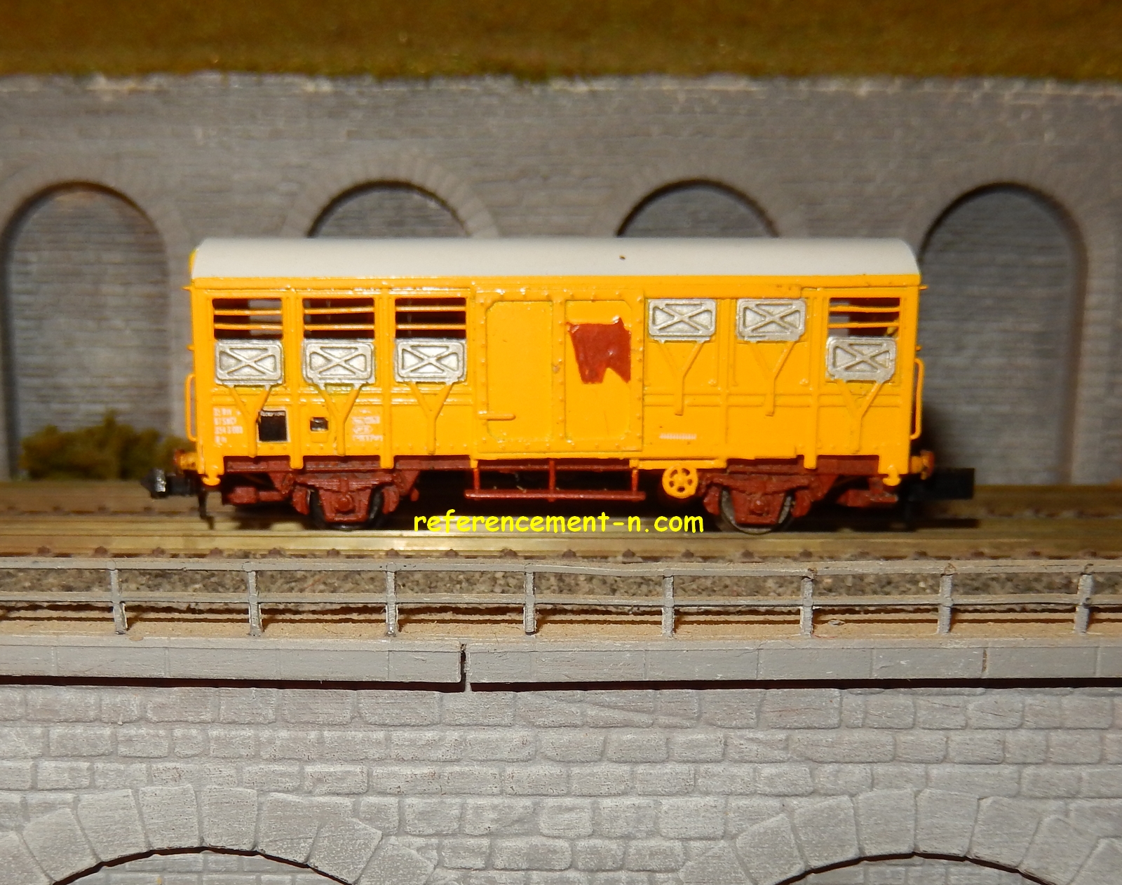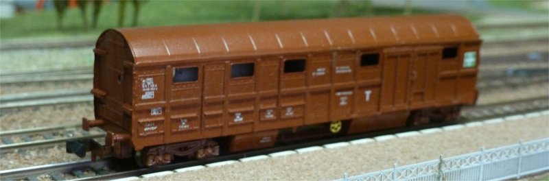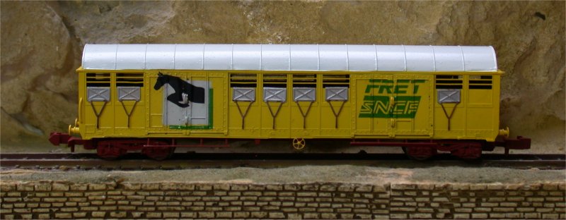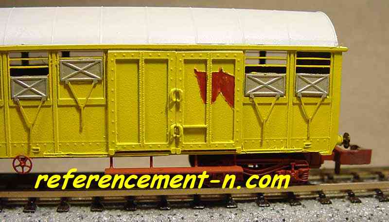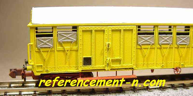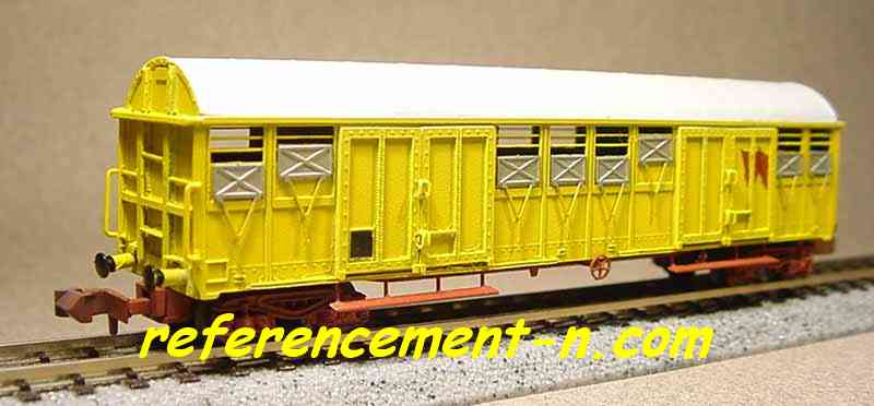 | Description | Wagon couvert à bogies jaune destiné au transport de bétail (bovins ou chevaux) ou brun type G11 | |